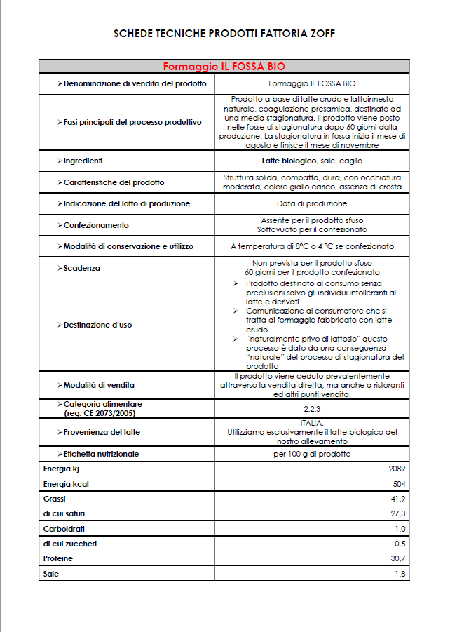 Il formaggio di Fossa bio della fattoria Zoff di Cormons prodotto con latte vaccino di produzione aziendale,  destinato a una stagionatura (minimo 60 giorni), per poi essere affinato in fossa dal mese di agosto al mese di novembre. Stagionatura minima 180 gg.